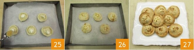 pressez bien le bord tout autour pour les sceller 22. Posez les biscuits sur une plaque de cuisson et incisez la surface avec un couteau pour créer des rayons 23. Mettez une pincée de beurre sur chaque biscuit 24.