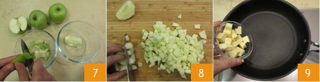 Pendant que la pâte brisée repose, occupez-vous de la garniture. Épluchez 7 et coupez les pommes en petits dés 8. Puis, dans une poêle, versez le beurre 9 et faites-le fondre à feu doux,