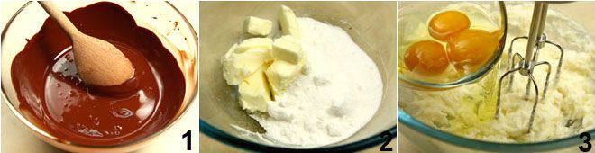 Faites fondre le chocolat noir au bain-marie ou au micro-ondes et laissez-le tiédir 1. Pendant ce temps, coupez le beurre en dés et laissez-le ramollir à température ambiante, puis ajoutez le sucre et les graines de la gousse de vanille 2 et battez avec un batteur jusqu'à obtenir un mélange clair et crémeux ; en continuant de battre, ajoutez les œufs un par un 3.