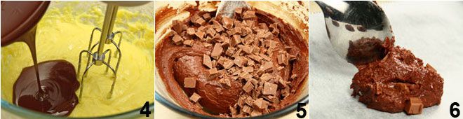 Enfin, ajoutez le sel et le chocolat fondu désormais tiède 4. À ce stade, ajoutez la farine et la levure préalablement tamisées, et enfin le chocolat au lait réduit en petits dés 5. Mélangez tous les ingrédients puis déposez la pâte par cuillerées sur une plaque à pâtisserie recouverte de papier sulfurisé 6. Sur une plaque de cuisson normale, vous pouvez mettre jusqu'à six cuillerées de pâte bien espacées entre elles (car en cuisant, les biscuits vont s'étaler) et enfournez dans un four ventilé préchauffé à 180°C pendant environ 15-20 minutes. Sortez les biscuits avec une spatule et déposez-les sur une grille pour les laisser refroidir. Procédez ainsi jusqu'à épuiser la pâte, avec laquelle vous devriez obtenir environ 15 biscuits qui, une fois cuits, auront un diamètre d'environ 8-9 cm.