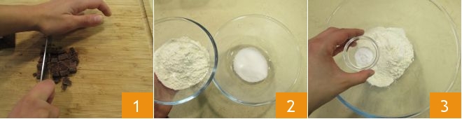 Pour préparer les cookies sans beurre, commencez par préparer le café avec la moka et laissez-le refroidir; il doit être assez corsé. Hachez grossièrement le chocolat noir 1 et mettez-le de côté. À ce stade, versez le sucre dans un bol avec la farine 2 et le bicarbonate 3.