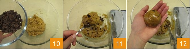 À ce stade, ajoutez les morceaux de chocolat 10 et incorporez-les à la pâte à l'aide d'une cuillère. Puis, toujours avec la cuillère, prélevez 70 g de pâte 11 et formez une boule 12 à la main, que vous déposerez sur une plaque recouverte de papier cuisson. Avec ces proportions, vous obtiendrez environ 10 biscuits sans beurre.