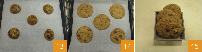 Poursuivez ainsi, en espaçant les portions de pâte entre elles 13; nous recommandons de faire 2 fournées, afin de cuire 5 biscuits à la fois (vous pouvez laisser les biscuits restants crus à température ambiante, en attendant la deuxième fournée). Faites cuire dans un four statique préchauffé à 180 pour environ 18 minutes. Sortez ensuite les biscuits du four 14 et laissez-les refroidir complètement avant de les transférer sur un plateau, car ils seront encore mous. Une fois refroidis, vos cookies sans beurre sont prêts à être servis 15 !