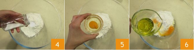 Ajoutez aussi le sel 4, l'œuf 5 et l'huile d'olive extra vierge 6.