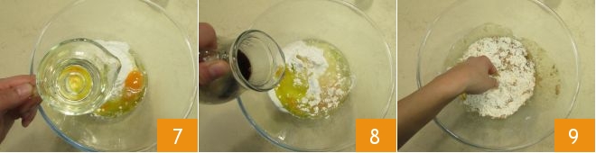 Enfin, versez l'huile végétale 7 et le café, désormais tiède 8. Travaillez le tout avec les mains 9 ou avec une cuillère en bois; vous obtiendrez une pâte d'une consistance souple.