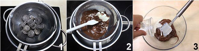 Pour préparer la coupe au mascarpone avec chocolat et meringues, commencez par faire fondre le chocolat au bain-marie 1 et ajoutez le beurre 2. Lorsque le chocolat et le beurre sont fondus, incorporez la crème à peine chauffée quelques secondes au micro-ondes ou dans une petite casserole 3 et mélangez avec une spatule pour obtenir un mélange homogène. Couvrez la crème de chocolat avec un film plastique et laissez-la reposer.