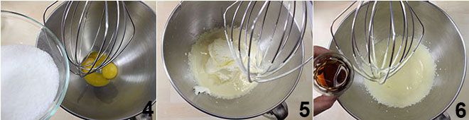 Entre-temps, dans un batteur sur socle ou avec un batteur électrique, fouettez les jaunes d'œufs avec le sucre 4 jusqu'à obtenir un mélange clair et mousseux. Ajoutez ensuite le mascarpone 5, mélangez à nouveau et incorporez enfin le marsala 6.