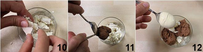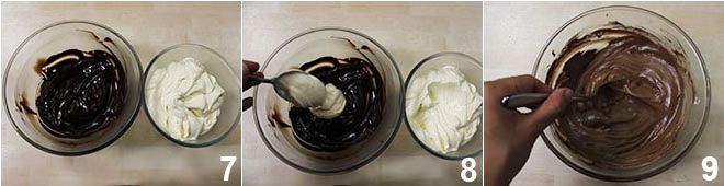 À ce stade, vous aurez la sauce au chocolat et la crème au mascarpone 7 : incorporez un tiers de la crème au mascarpone à la sauce au chocolat 8 et mélangez bien pour obtenir la crème de mascarpone au chocolat 9.