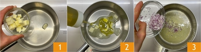 Pour réaliser les coquilles Saint-Jacques avec lard et crème de marrons, commencez par préparer la crème de marrons : dans une petite casserole, faites fondre le beurre 1 avec un filet d'huile 2, puis ajoutez l'échalote finement hachée 3 et laissez-la suer quelques minutes.