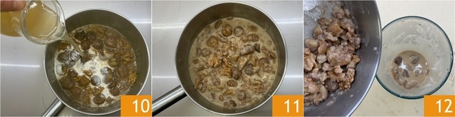 Enfin, couvrez avec le bouillon de légumes 10. Réduisez le feu et laissez mijoter environ 15 minutes, juste le temps de ramollir les noix 11. Après ce temps, transférez le mélange dans le bol d'un mixeur 12.