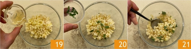 Ajoutez également un peu de vinaigre de cidre 19 et quelques feuilles de marjolaine 20. Mélangez 21 et réservez.