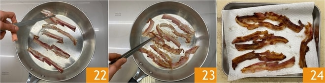 Passez au lard : placez les tranches de lard dans une poêle 22, puis allumez le feu doux et laissez-les suer pour qu'elles libèrent leur graisse et deviennent croustillantes, en les retournant des deux côtés 23. Lorsqu'elles sont bien grillées, transférez les tranches de lard sur du papier absorbant et réservez 24. Conservez la poêle avec le fond de cuisson.