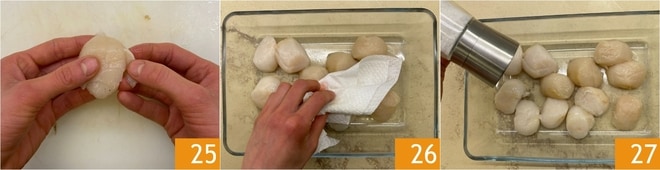 Enfin, occupez-vous des coquilles Saint-Jacques : retirez le muscle pour obtenir la noix 25, puis épongez bien avec du papier absorbant 26 et salez 27.
