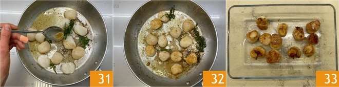 Poursuivez la cuisson en nappant les coquilles Saint-Jacques avec le beurre fondu, qui recueillera la saveur des herbes aromatiques et du fond de cuisson 31. Faites cuire les coquilles Saint-Jacques seulement d'un côté et, lorsqu'elles sont bien colorées 32, retirez-les de la poêle 33.