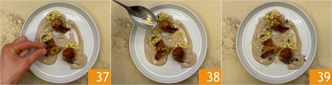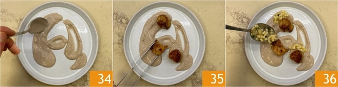 Vous êtes prêt à dresser : étalez la crème de marrons sur le fond de l'assiette 34, puis disposez les coquilles Saint-Jacques par-dessus 35 ainsi que les dés de pomme 36.