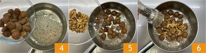 Quand l'échalote est suée, ajoutez les marrons que vous aurez préalablement fait bouillir (vous pouvez aussi utiliser des marrons précuits) 4 et les noix 5. Salez et poivrez 6.