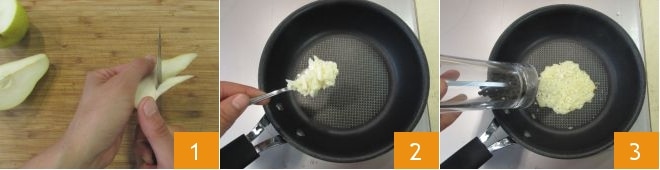 Pour réaliser les coquilles Saint-Jacques et poires en feuilleté de Grana Padano, commencez par préparer les poires : lavez et coupez la poire en deux, puis divisez l'une des moitiés en 6 quartiers et éliminez le trognon avec un petit couteau 1. Râpez le Grana Padano DOP avec une râpe à gros trous et chauffez une petite poêle antiadhésive. Lorsqu'elle est bien chaude, versez au centre une cuillère de Grana Padano DOP râpé 2 et donnez-lui la forme d'un cercle, puis ajoutez un tour de moulin à poivre 3.