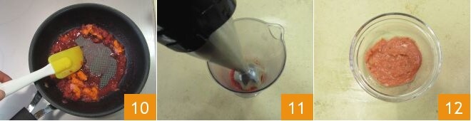 et faites sauter le tout à feu moyen pendant quelques minutes car le liquide ne doit pas trop réduire 10. Transférez le mélange dans un verre haut et étroit et mixez avec un mixeur plongeant 11, en vous aidant si nécessaire avec une cuillère d'huile d'olive : vous devez obtenir une consistance similaire à celle de la mayonnaise 12.