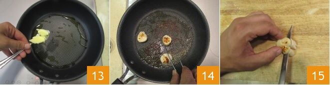 Dans une autre petite poêle, chauffez un filet d'huile avec le beurre clarifié 13 et faites sauter les noix des coquilles Saint-Jacques à feu vif pendant 1 minute de chaque côté, jusqu'à ce qu'elles soient dorées 14. Transférez-les sur une planche à découper et coupez 2 coquilles Saint-Jacques en deux dans le sens horizontal 15.