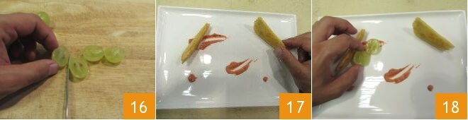 À ce stade, divisez les grains de raisin en deux 16 et retirez les pépins, puis vous pouvez passer à la composition de l'assiette : commencez par quelques touches de sauce aux groseilles, puis déposez 2 poires en feuilleté par personne 17 et garnissez avec quelques grains de raisin 18.