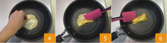 Lorsque la tuile aura formé une légère croûte à la base, déposez au centre un quartier de poire 4 et enroulez-le avec les bords de la tuile, en les soulevant délicatement avec une spatule (5-6) : cela prendra au maximum quelques minutes, en gardant le feu moyen-bas. Répétez l'opération pour réaliser au total 6 poires en feuilleté.