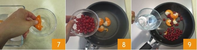 Maintenant, séparez le corail de la noix des coquilles Saint-Jacques 7 et réservez ces dernières. Chauffez une autre petite poêle et ajoutez-y à la fois les coraux et les groseilles 8, versez l'eau 9, salez