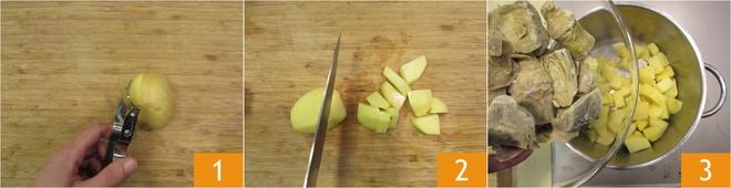 Pour préparer les coquilles Saint-Jacques sur crème d'artichauts et herbes aromatiques, commencez par la crème: épluchez 1 et coupez les pommes de terre en morceaux d'environ 2 cm 2, mettez-les dans une casserole avec les cœurs d'artichauts 3.