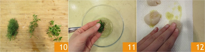 Hachez les herbes aromatiques (marjolaine, fenouil et menthe) 10, en conservant quelques feuilles entières de marjolaine. Quand la crème d'artichauts et de pommes de terre est tiède, ajoutez les herbes hachées 11 et mélangez bien, si nécessaire rectifiez l'assaisonnement en sel et poivre. Enfin, occupez-vous des coquilles Saint-Jacques: lavez-les et séchez-les bien, huilez-les soigneusement avec de l'huile d'olive extra vierge 12.