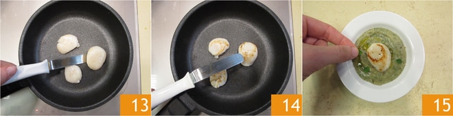 Chauffez bien une poêle antiadhésive, le fond doit être brûlant: faites dorer les coquilles Saint-Jacques des deux côtés à feu vif 13 14, en très peu de temps elles seront dorées. Dressez le plat: versez deux cuillères de crème d'artichauts sur chaque assiette, placez une coquille Saint-Jacques au centre, ajoutez quelques gouttes d'huile de piment. Assaisonnez avec une pincée de mélange de grains de poivre fraîchement moulus, deux feuilles de marjolaine 15 et quelques grains de sel sur la coquille Saint-Jacques.