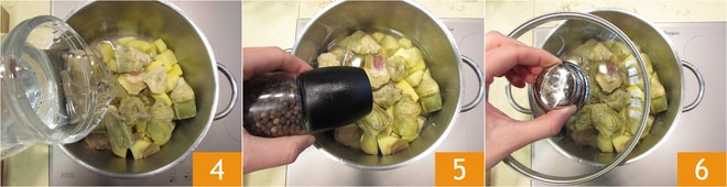 Versez 250 g d'eau 4, salez et poivrez à votre goût 5, puis faites cuire pendant environ 20 minutes à feu moyen-vif, avec couvercle 6.