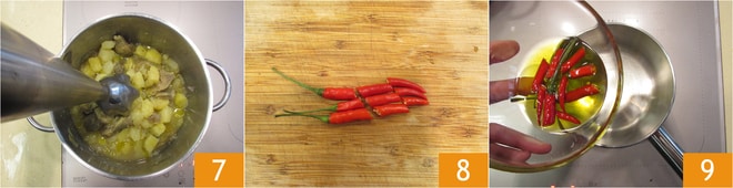 Quand elle est prête, mixez le tout avec un mixeur plongeant 7, jusqu'à obtenir une crème homogène. Pendant ce temps, préparez l'huile piquante: coupez les piments frais en 3 parties 8, mettez-les dans une casserole avec 20 g d'huile d'olive extra vierge 9. Laissez infuser à feu très doux pendant environ 7 minutes, puis éteignez le feu et mettez de côté.
