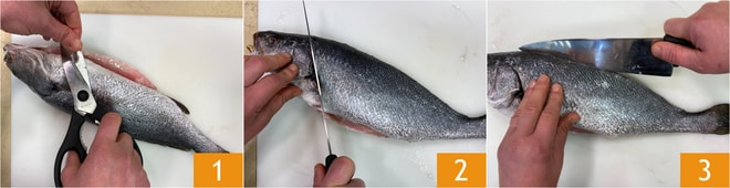 Pour préparer le corb au four, commencez par le Comment nettoyer le maigre. Pratiquez une incision sur le ventre, jusqu'à la tête, retirez les viscères et rincez sous l'eau courante pour éliminer toutes les impuretés. Écaillez avec l'outil approprié ou avec le dos d'un couteau sous l'eau courante. Coupez les nageoires ventrales et dorsales 1. Faites une incision oblique 2, juste après les branchies, partant du dos et rejoignant l'incision sur le ventre. Incisez la queue et la partie dorsale du poisson en suivant la colonne vertébrale 3. Ainsi, vous aurez obtenu le premier filet, répétez la même procédure pour le second filet.