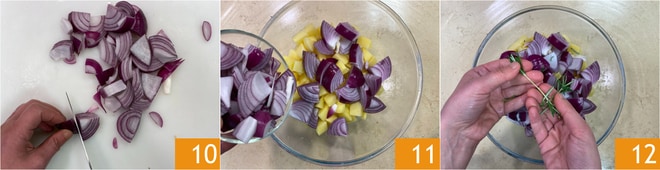 Coupez les oignons en quartiers 10. Réunissez pommes de terre et oignons dans un bol 11 et assaisonnez avec du romarin 12.