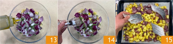 Ajoutez de l'huile 13, du sel et du poivre 14. Mélangez pour que l'assaisonnement enrobe bien tous les légumes. Placez-les ensuite sur une plaque recouverte de papier cuisson et faites cuire au four statique, préchauffé, à 200°C pendant 35 minutes. Sortez la plaque du four et déposez les filets de corb sur les légumes 15. Remettez au four et faites cuire encore 10 minutes dans les mêmes conditions. Le poisson doit être doré, cuit mais pas sec.