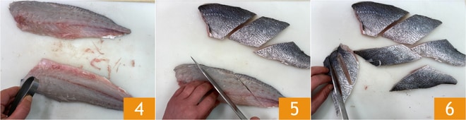 Retirez avec la pince éventuelles arêtes 4. Coupez les filets en losanges d'environ 180 g chacun 5 et pratiquez 2-3 incisions sur la peau 6.