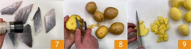 Ajoutez du sel des deux côtés des filets 7 et réservez jusqu'au moment de l'utilisation. Épluchez les pommes de terre 8 et coupez-les en cubes 9.