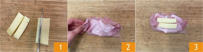 Pour préparer les cordons bleus avec friteuse à air, coupez le fromage gruyère en tranches d'environ 1 cm d'épaisseur 1. Placez une tranche de blanc de poulet sur la planche à découper, déposez dessus une tranche de jambon cuit 2 et, ensuite, 2 tranches de gruyère 3.