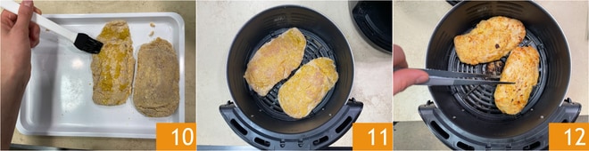 Huilez légèrement les cordons bleus avec de l'huile en utilisant un pinceau 10. Insérez-les dans la friteuse à air (nous avons utilisé une friteuse avec une capacité de 6 litres) 11 et faites cuire à 195° pendant 16 minutes, en les retournant à mi-cuisson 12.