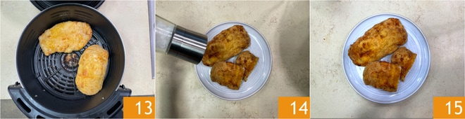 Une fois prêts 13, transférez-les dans une assiette, salez 14 et servez immédiatement les cordons bleus avec friteuse à air 15.