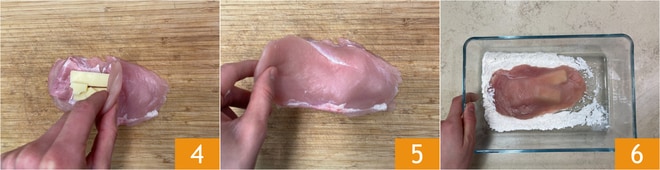 Couvrez avec une autre tranche de blanc de poulet 4. La quantité de fromage et de jambon insérée doit être telle que les tranches de poulet se touchent pour sceller les bords et éviter la fuite de la farce pendant la cuisson 5. Passez le cordon bleu dans la farine 6.