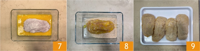 Puis plongez-le dans l'œuf battu 7, ensuite dans la chapelure 8. Vous obtiendrez ainsi 4 cordons bleus 9.