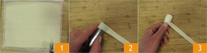 Pour préparer les cornets salés au chèvre et pancetta, commencez par dérouler la pâte feuilletée. Ensuite, utilisez une roulette pour couper des bandes sur le côté le plus long de 1 cm de large 1, vous en obtiendrez 24. Prenez une des bandes et fixez-la à une des extrémités des cônes 2, puis commencez à enrouler la pâte autour, en la serrant délicatement 3 et lorsque vous aurez terminé la pâte, pincez délicatement l'extrémité finale. Les cônes que nous avons utilisés ont une épaisseur de 1,5 cm et une longueur de 15 cm.