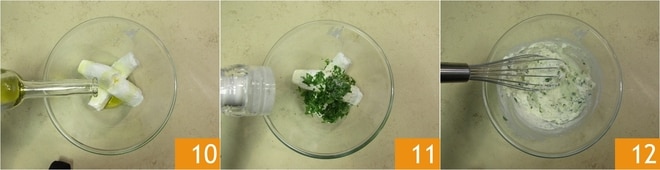 Mettez dans un bol le fromage de chèvre, un filet d'huile 10, du persil haché, une pincée de sel 11 et du poivre. Mélangez bien avec un fouet 12,