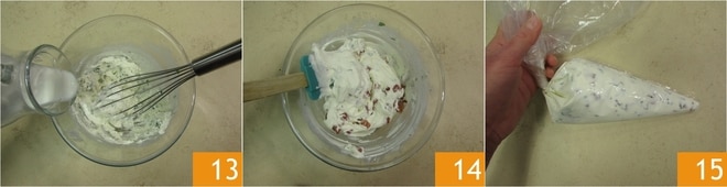 puis ajoutez la crème pour ramollir le mélange 13 et mélangez à nouveau. Ajoutez les dés de pancetta croustillants et mélangez avec une spatule pour les incorporer. Transférez le mélange dans une poche à douille 15