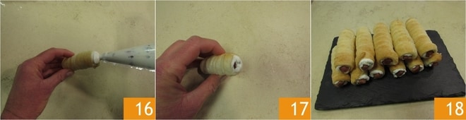 et utilisez-la pour garnir les cornets de feuilletage 16. Essayez de les remplir autant que possible 17. Continuez de cette façon jusqu'à ce que vous ayez épuisé les ingrédients et servez-les !