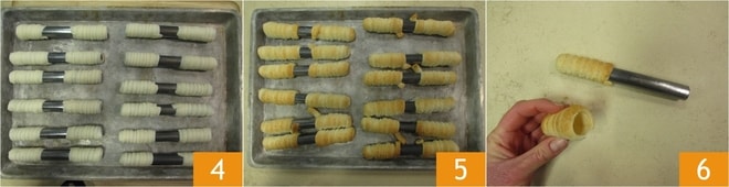 Si vos cônes sont assez longs, vous pouvez en réaliser un autre de l'autre côté. Disposez-les progressivement sur une plaque. Faites cuire dans un four statique préchauffé à 200° sur la grille centrale pendant 15 minutes. Lorsque les cornets sont bien dorés, sortez-les du four 5 et laissez-les tiédir. Démoulez ensuite délicatement les cornets 6, en effectuant un léger mouvement rotatif s'ils ne se détachent pas. Mettez de côté et laissez refroidir complètement.