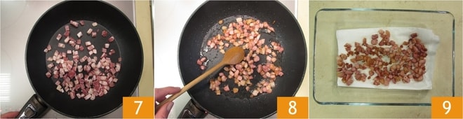 Chauffez une poêle, ajoutez les dés de pancetta 7 et laissez-les cuire pendant quelques minutes, en remuant souvent 8. Lorsqu'ils sont croustillants, égouttez-les et transférez-les dans un plat ou un plateau avec du papier absorbant 9. Mettez de côté un moment.