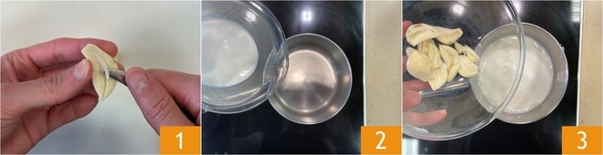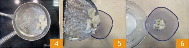 Portez à ébullition, puis égouttez-les 4. Répétez ce procédé 2 fois de plus en remplaçant le lait à chaque fois. Enfin, transférez les gousses dans un récipient 5, ajoutez les 100 g de lait restants 6 et salez.