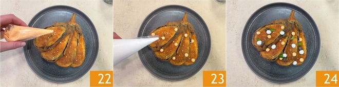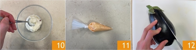 Mélangez 10, transférez dans une autre poche à douille 11 et conservez au réfrigérateur. Passez maintenant aux aubergines : éliminez les extrémités latérales, puis coupez-les en 4 tranches en les laissant attachées à la tige 12.