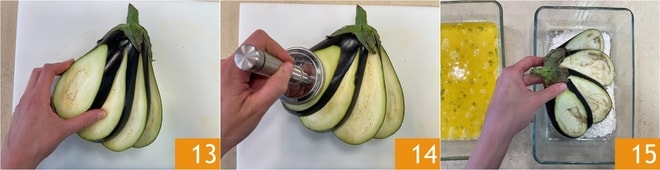 Ouvrez les tranches en éventail 13 et écrasez-les délicatement avec un attendrisseur pour les aplatir 14. Passez-les d'abord dans la farine 15.